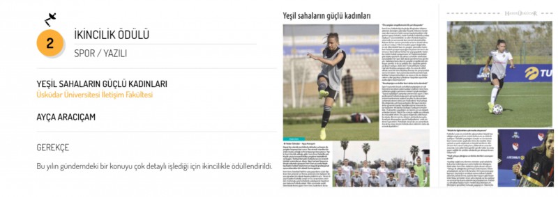Üsküdar Üniversitesi İletişim Fakültesi Yeni Medya ve Gazetecilik Bölümü öğrencisi Ayça Aracıçam, Yazılı Dal Spor Kategorisi’nde Arş. Gör. Selin Maden danışmanlığında hazırladığı ‘Yeşil Sahaların Güçlü Kadınları’ isimli projesi ile ikincilik ödülünün sahibi oldu.