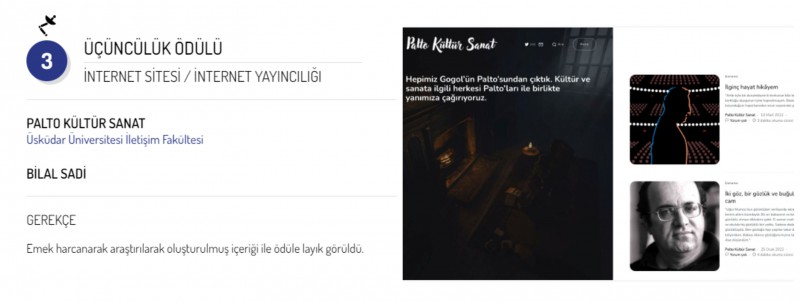 Yeni Medya ve Gazetecilik Bölümü mezunu Bilal Sadi, İnternet Yayıncılığı Dalı İnternet Sitesi Kategorisi’nde Dr. Öğr. Üyesi Özlem Çetin Öztürk ve Arş. Gör. Selin Maden danışmanlığında hazırladığı ‘Palto Kültür Sanat’ isimli projesi ile üçüncülük ödülünün sahibi oldu.