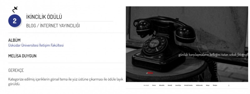 Üsküdar Üniversitesi İletişim Fakültesi Yeni Medya ve Gazetecilik Bölümü öğrencisi Melisa Duygun, İnternet Yayıncılığı Dalı Blog Kategorisi’nde Arş. Gör. Selin Maden ve Arş. Gör. Atila Erdemir danışmanlığında ‘Albüm’ isimli projesi ile ikincilik ödülünün sahibi oldu.
