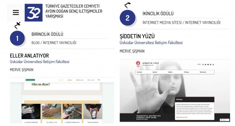 Üsküdar Üniversitesi İletişim Fakültesi Yeni Medya ve Gazetecilik Bölümü öğrencisi Merve Şişman, İnternet Yayıncılığı Dalı Blog Kategorisi’nde Prof. Dr. Süleyman İrvan ve Arş. Gör. Selin Maden danışmanlığında hazırladığı ‘Eller Anlatıyor’ isimli projeyle birincilik ve yine İnternet Yayıncılığı Dalı İnternet Medya Sitesi Kategorisi’nde ‘Şiddetin Yüzü’ isimli proje ile ikincilik ödülünün sahibi oldu.