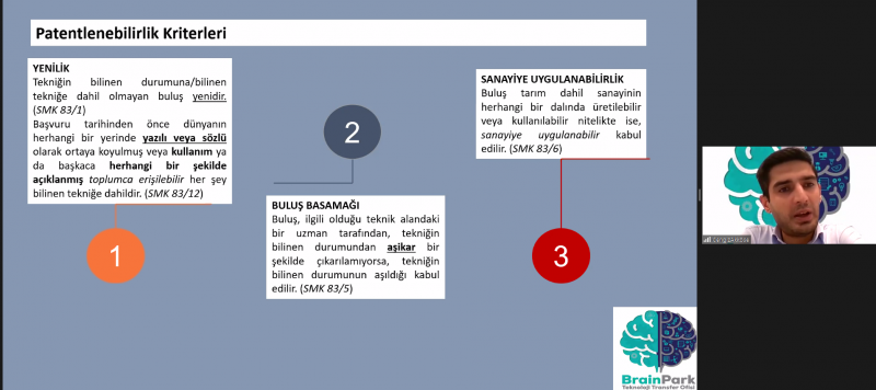 Eğitimin ikinci bölümünde ise Fikri ve Sınai Mülkiyet Uzmanı Cengiz Akköse, telif hakları ve sınai mülkiyet hakları konusuna değindi. Akköse, patent nedir, buluş nedir, buluş fikri nedir, fikri mülkiyet nedir, fikirlerin korunması hakkında neler yapılabilir gibi çeşitli konular üzerinde durarak akademisyenleri bilgilendirdi.