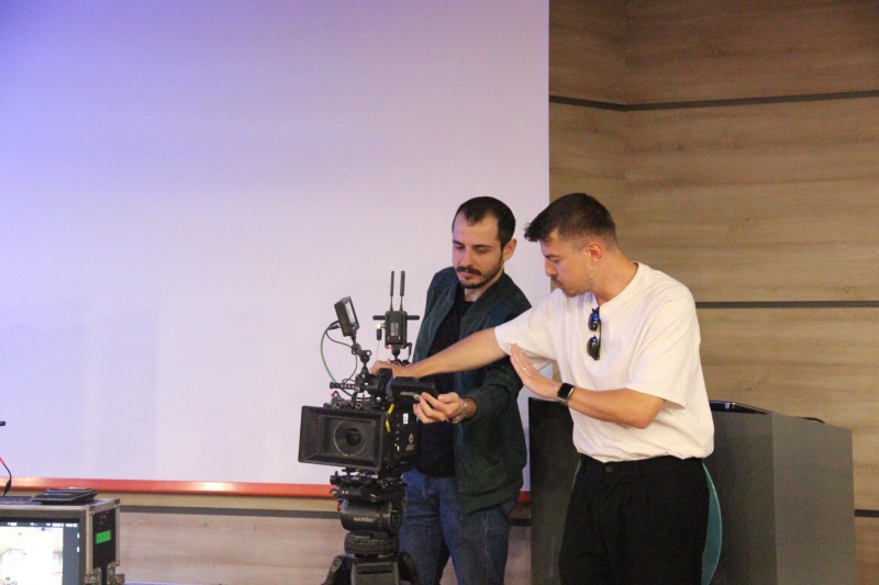 ARRI Alexa 35 kamera ve ARRI Ultra Prime lens seti ile yapılan uygulamalı çalışmalarda öğrenciler, güncel sinema teknolojisini profesyonellerden birebir deneyimleme fırsatı buldu. Fuat Sezgin Konferans Salonu’nda gerçekleşen etkinlikte kamera kurulumu, görüntü yönetiminde ışık-materyal ilişkisi, set iş akışı ve DIT süreçleri üzerine detaylı bilgiler paylaşan İnce ve Kaleli, sektörde edindikleri birikimleri öğrencilerle samimi bir şekilde aktardı.