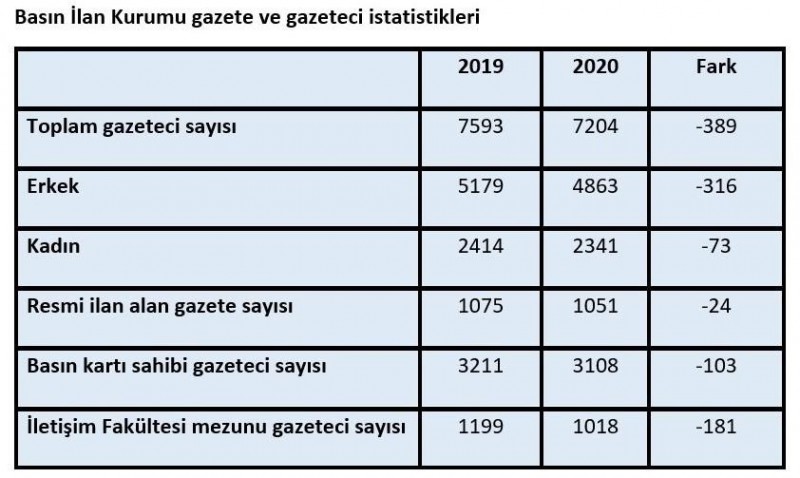 Basın İlan Kurumu tarafından paylaşılan resmi ilan alan gazeteler ile bu gazetelerde çalışan gazetecilere ilişkin 2020 yılı istatistikleri, gazeteciliğin pandemi sürecinde kan kaybettiğini gösteriyor. 2020 yılı verilerini tek başına değerlendirmenin doğru olmayacağını ifade eden Üsküdar Üniversitesi İletişim Fakültesi Gazetecilik Bölümü Başkanı Prof. Dr. Süleyman İrvan, 2019 yılı için hazırlanan raporla karşılaştırıldığında resmi ilan alma hakkına sahip gazete sayısının 1075’ten 1051’e düştüğünü, 24 gazetenin pandemi sürecinde kapanmış olabileceğini ifade etti.
