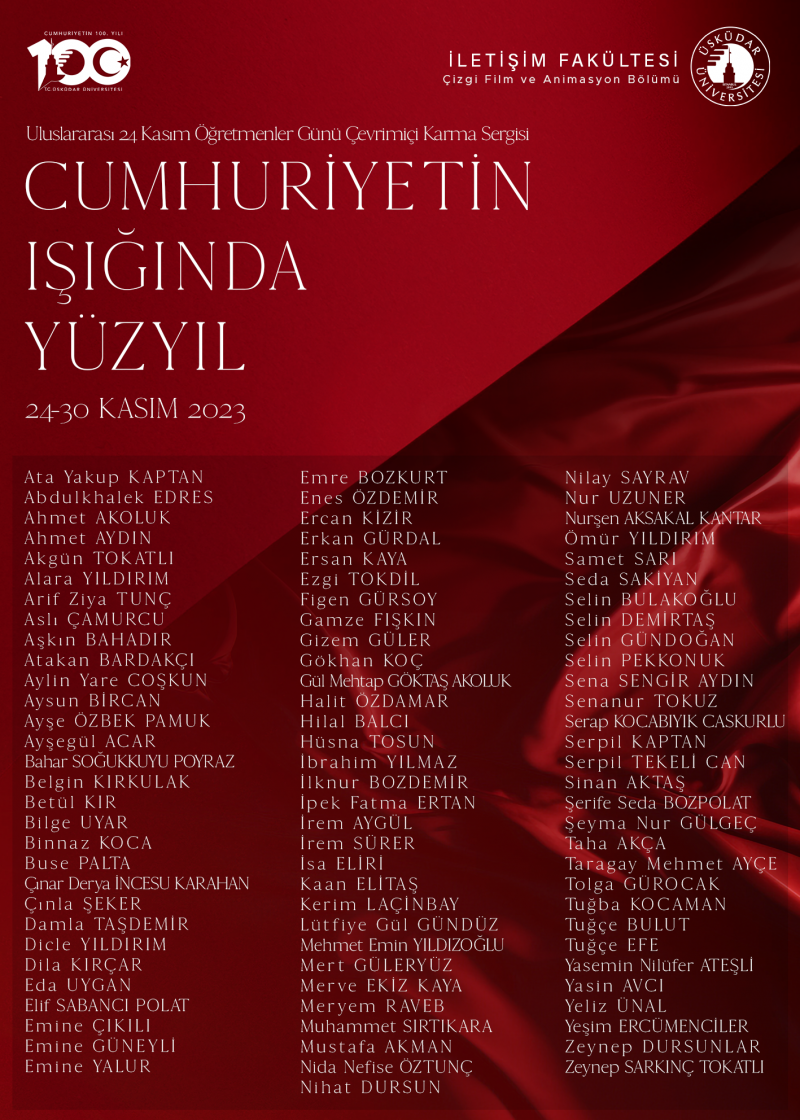 Üsküdar Üniversitesi İletişim Fakültesi Çizgi Film ve Animasyon Bölümü’nün düzenlediği "Cumhuriyetin Işığında Yüzyıl-Uluslararası 24 Kasım Öğretmenler Günü Çevrimiçi Karma Sergisi" erişime açıldı.