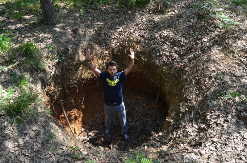 Kemerburgaz muhtarına açıklamaları için teşekkür ettikten sonra kazıların yapıldığı bölgeye gidiyoruz. Define avcılarının tarihi su kemerlerine nasıl zarar verdiklerini, üzerinde delikler açıp nasıl içine girdiklerini gözlerimizle görüyoruz ve fotoğraflıyoruz. Ormanın biraz daha içine doğru ilerlemeye başladığımızda Gürkan Yılmaz’ın söz ettiği kazıları görüyoruz. İlk gördüğümüz kazı yaklaşık iki metre derinliğinde ve üç metre genişliğinde büyük bir çukur oluşturmuş. Böylesine büyük bir çukuru iş makinalarıyla kazdıklarını düşünüyoruz, ancak ormanın o bölgesine iş makinalarının girebileceği bir yol olmadığını farkediyoruz. Bu durum, definecilerin ne kadar ciddi ve istekli olduklarını gösteriyor. Biraz daha ilerledikten sonra karşımıza ikinci çukur çıkıyor. Yaklaşık bir metre genişliğinde ve üç metre derinliğinde olan çukur, dışarıdan bakılınca çok belirgin olmadığından ormanda gezinen insanlar için de tehlike oluşturuyor. Burada yürüyüş yapan insanların çukura düşüp sakatlanabileceklerini düşünüyoruz. Belgrad ormanının definecilerin elinde deliş deşik hale gelmesine üzülüyoruz.