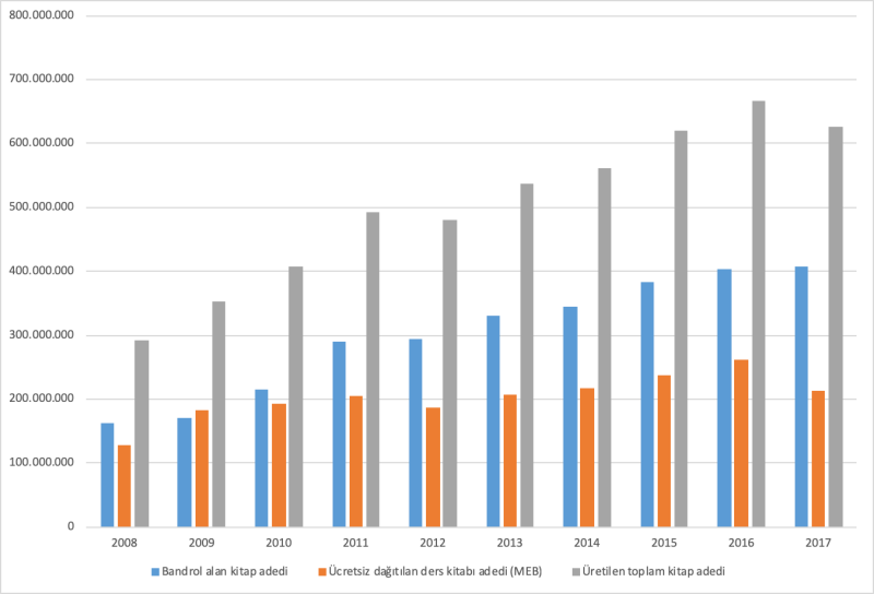 Bandrol dağıtımı ve satışını yapan YAYFED’in (Yayımcı Meslek Birlikleri Federasyonu) açıkladığı verilere göre 2018 yılında bandrolü 410 milyon 641 bin 305 adet kitap basıldı. Türkiye Yayıncılar Birliği sitesinde yer alan bilgilere göre, 2017 yılında 407 milyon 739 bin 008; 2016 yılında 404 milyon 129 bin 293 bandrollü kitap basıldı. Ancak, bandrollü yayımlanan kitapların yarıdan fazlasını (%52) sınavlara hazırlık kitaplarıyla yardımcı kaynak kitaplar oluşturuyor. 2018 yılında yayımlanan bandrollü kitapların 215 milyonunu bu türden eğitim kitapları oluşturuyor.