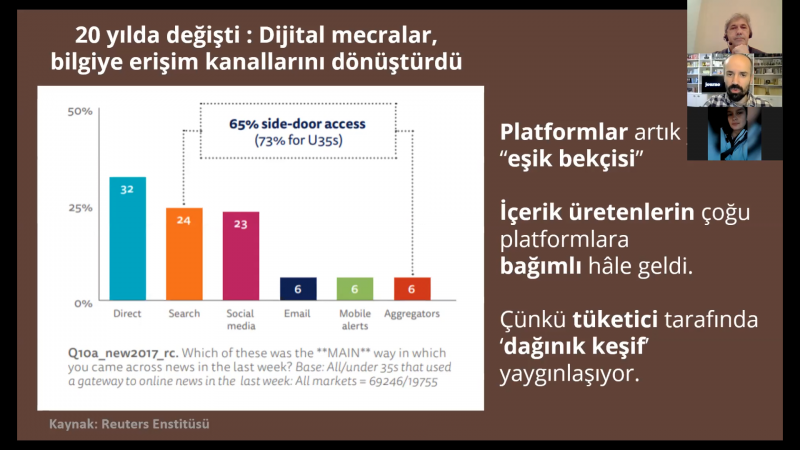 Kızılkaya sosyal medya platformları hakkında, "20 yılda dijital mecralar bilgiye erişim kanallarını dönüştürdü. Son yirmi yılda çok önemli şeyler oldu. İlki internetin yaygınlaşması, ikincisi özellikle 2000’li yılların başından itibaren mobil cihazların kişisel verilerinizi toplayarak size sürekli bilgi ulaştırabilmesi. Bütün bunlar olurken o verileri toplayan Google ve Facebook gibi aktörler daha etkili reklamlar sunmayı başardılar. Haber dendiğinde akla gazetenin gelmiyor olmasının gelir yapısı açısından bir anlamı var. İnsanlar arka kapılardan, arama motorları ve sosyal medya, Facebook, Google vs. gibi alternatif hatlarla habere ulaşıyorlar. Bu oran arttıkça sosyal medya platformları eşik bekçisi haline geliyor. Haber üretenler ise o platformlara bağımlı hale geliyor. İnsanlar haber mecralarına çok fazla yönelmiyorlar. Etkileşimi yükseltmek için de habercilerin birtakım numaralara yöneldiğini görüyoruz” dedi. Haber platformlarının sosyal medya ağları ile rekabet içine girdiklerinde ekonomik kaygıların haber yazımını kontrol etmeye başladığını belirten Kızılkaya, sözlerini, "Kimileri cinsel içerikleri ön plana çıkartıyor. Etkileşim yaratıyorlar belki ama markaya zarar veriyorlar” şeklinde sürdürdü.