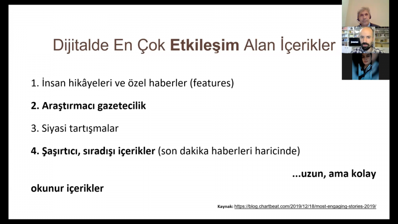 Dijitalde en çok etkileşim alan içeriklerin insan hikâyeleri, özel haberler, araştırmacı gazetecilik çalışmaları ve siyasi tartışmalar olduğunu belirten Kızılkaya, “Bunlar uzun ama kolay okunur olursa çok fazla etkileşim yaratıyorlar” dedi. Özgün haber dilinin önemine de dikkat çeken Kızılkaya, “Gazeteciyi bir ressama benzetirsek, gazetesi aslında çerçevedir. Resim ise içeriğin, haberin kendisidir. Ressamlar bunu boyalar ile belirler, medya ise formatı belirler. Fırçayı tutmanın belli bir yöntemi vardır. Gazetecilikte de belli bir yöntem vardır ve bu yönüyle habercilik bir sanat ya da zanaattır. Kamu ile haberleştiğimiz, etkin bir iletişim sağlamaya çalıştığımız için olabildiğince net ve açıklayıcı bir biçimde yazmamız gerekir. Aktarma işlemini özgünlüğümüzü koruyarak yapabiliriz. Belli klişelere göre haber formatının yapılması bir zorunluluk değildir. Haberlerin başlığı uzun veya kısa olacak diye bir şey yok. Eskiden gazetedeki sütunlara sığdırmak için başlıkları küçültmemiz gerekiyordu ama artık dijital alanın imkânlarına sahibiz. Haber gerektiği kadar uzun olmak zorunda" dedi.