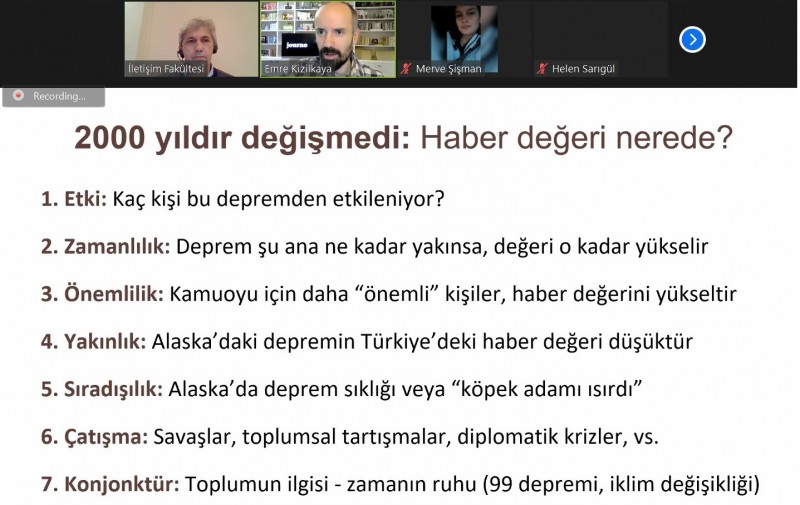 Emre Kızılkaya, “Yeni medyada haber yapımı, haber yazımı, 5N1K gibi konuları pratik üzerinden konuşursak” diyerek yakın zamanda yaşanan İzmir depremiyle ilgili bir haber başlığını gösterdi ve sözlerini şöyle sürdürdü: "İzmir’de deprem oldu’ başlıklı haber size ne söylüyor, iyi bir başlık mı? Gizlilik veya bir eksiklik hissi var. Ne olduğunu söylüyor bize ama sadece neyin nerede olduğunu söylüyor. Başka bir şey söylemiyor. Böyle bir başlık görüyoruz, sonra genelde haberi özetleyen bir spot olur. Mahreç haberin yazıldığı yeri ve yazan kişiyi gösterir, sonra haber başlar ve haber gövdesi gelir. Ara başlık kullanılabilir, haber gövdesi devam eder ve haber biter. ‘İzmir’de deprem oldu’ gibi bir başlıktan yola çıkarsak, 'Nerede?' olduğunu sorduğumuzda ben sizlere İzmir Görece’de olduğunu söylersem, Görece dediğimde, siz yeni bir deprem mi diye sorarsınız. Oysa başlık bu sorulara en başından cevap vermelidir” dedi.