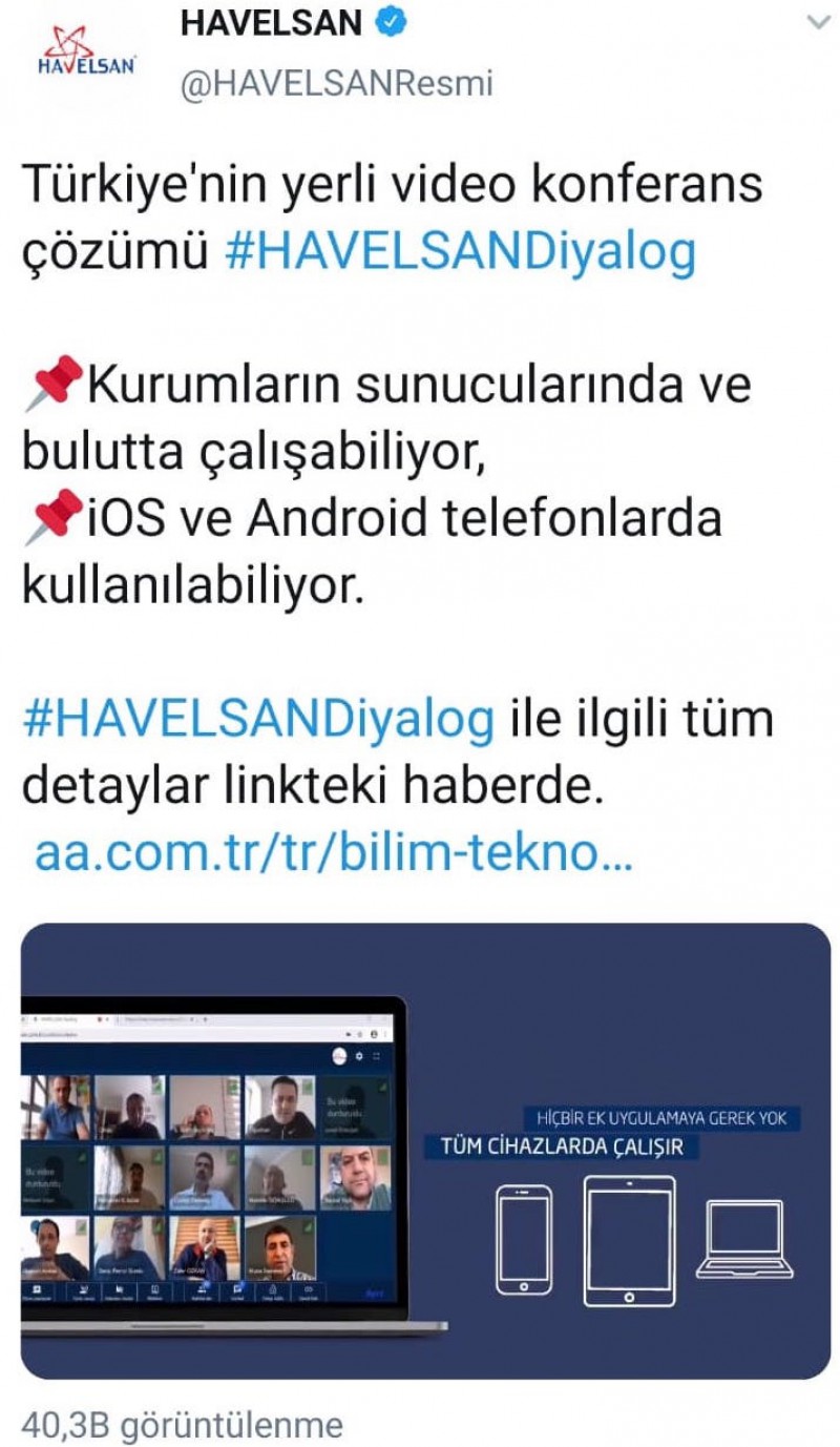 Türkiye'nin en önemli teknoloji firmalarından biri olan HAVELSAN, Twitter adresinden, Türkiye'nin yerli video konferans çözümü HAVELSAN Diyalog'u geliştirdiklerini duyurdu. HAVELSAN, Koronavirüs salgını sonrası görüntülü konuşma uygulamalarına artan talep ve bazı uygulamalarda görülen güvenlik açıkları sebebiyle, Türkiye'nin yüksek güvenlikli yerli video konferans yazılımını ürettiklerini ve Mayıs ayı içerisinde kullanıma sunacaklarını ilan etti.