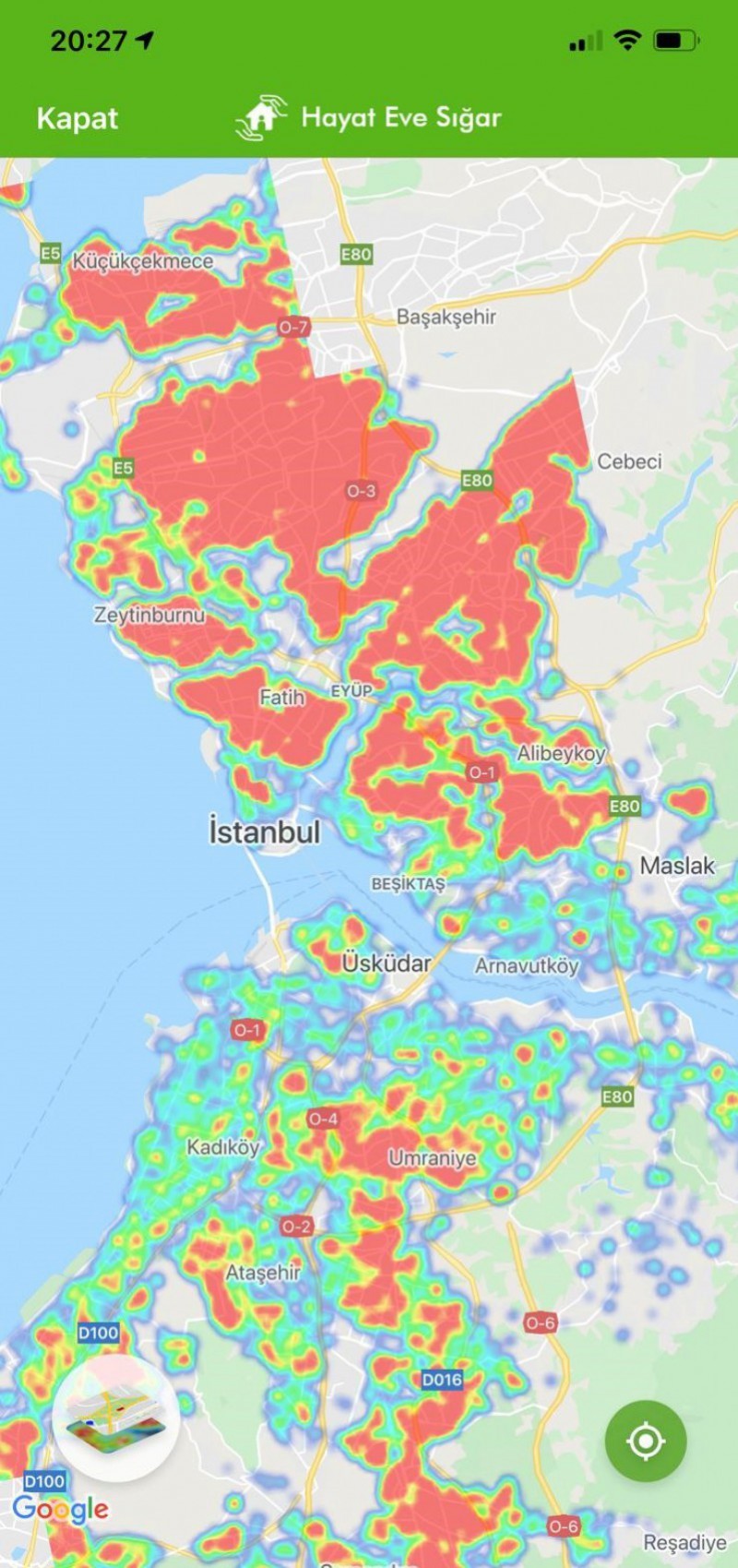 Uygulama, konum servislerine izin verildiğinde, bireyleri riskli bölgelere yaklaştığında uyarıyor ve haritada anlık olarak yaklaşılmaması gereken alanları gösteriyor. Kırmızı halkalar yüksek riskli bölgeleri ifade ederken, yeşil halkalar ise az riskli bölge anlamını taşıyor.
