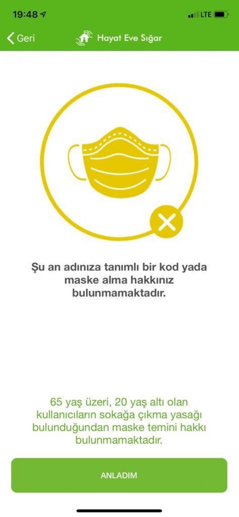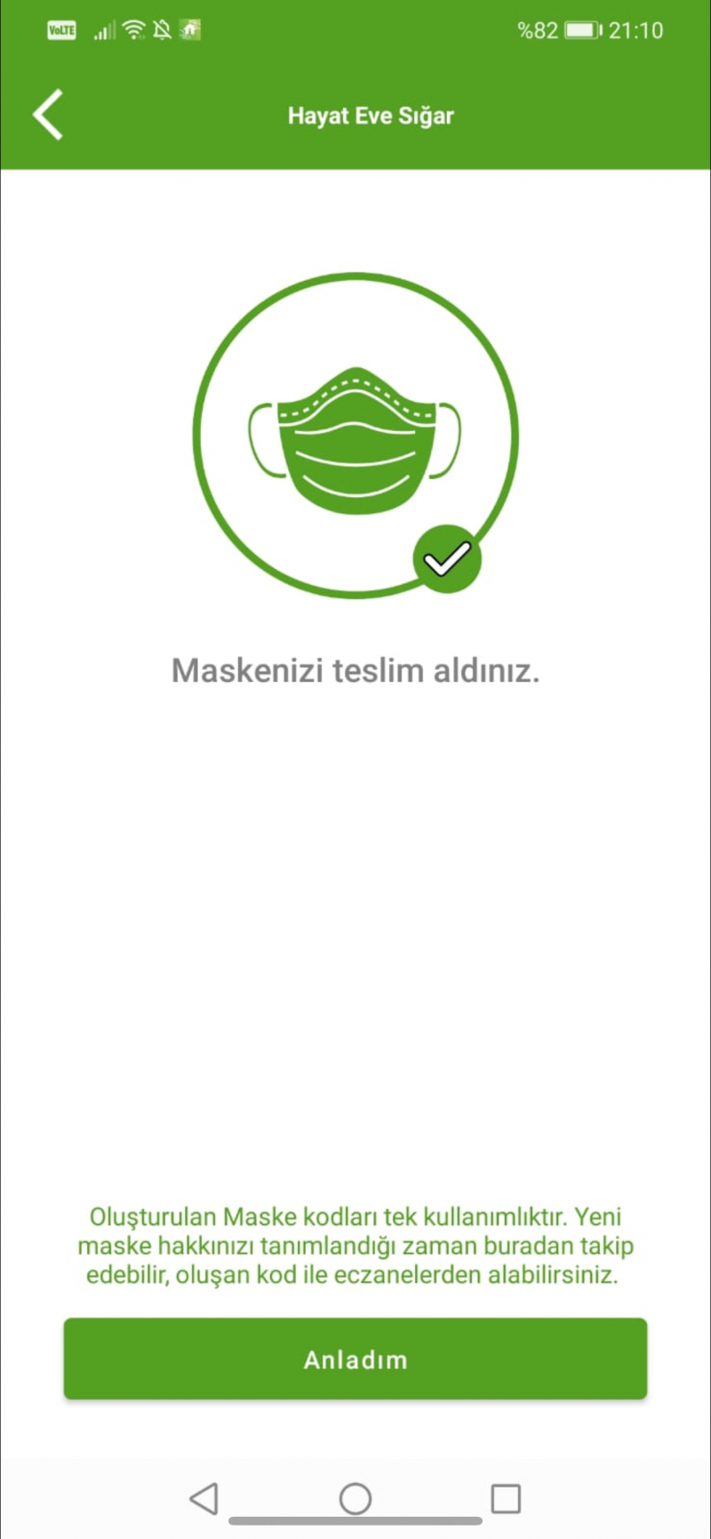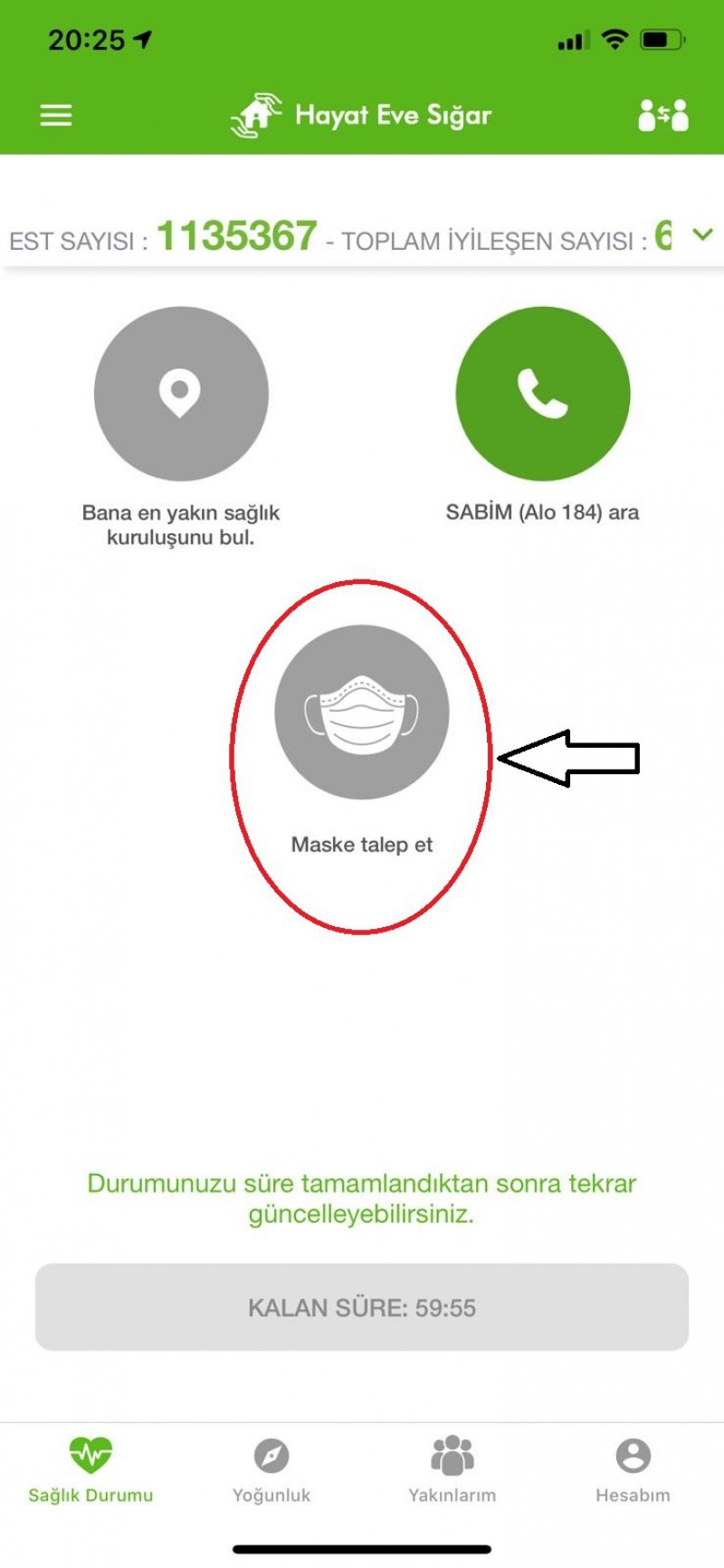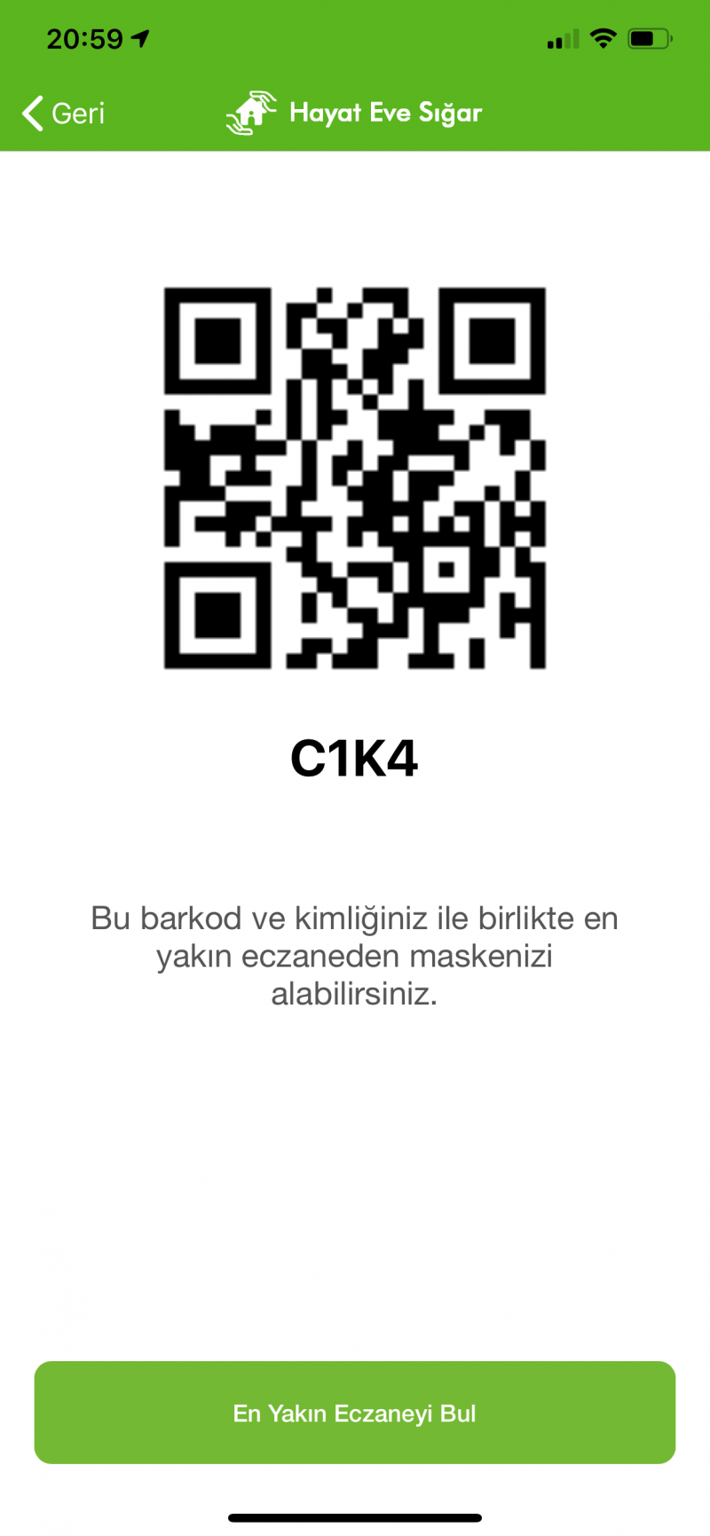 Hayat Eve Sığar isimli mobil uygulama, ücretsiz maske kodu alınmasına da yardımcı oluyor. Uygulamada ‘maske talep et’ diyen yurttaşlar üç farklı durumla karşılaşıyor. Maskesini ilk defa uygulama üzerinden talep eden yurttaş, oluşan ‘kare kod’ ile birlikte eczanelerden maske temin edebiliyor. Maske başvurusunu daha önce E-Devlet üzerinden yapmış olanlara “maskenizi teslim aldınz” uyarısı çıkıyor. Yeni maske hakkı geldiği zaman ise tekrar uygulama üzerinden talepte bulunulabiliyor. Son olarak, 20 yaşından küçük olanlar ile 65 yaşından büyük olanlar, sokağa çıkma yasaklarından dolayı maske talep edemiyor.
