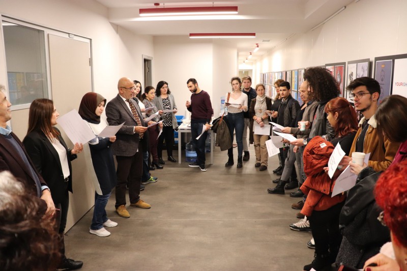 Sergide İnsan Hakları Evrensel Bildirgesi’ne dair farkındalığı arttırmak için bildirgenin maddeleri yüksek sesle okundu. Ziyaretçiler, Üsküdar Üniversitesi İletişim Fakültesi Yeni Medya ve Gazetecilik Bölüm Başkanı Prof. Dr. Süleyman İrvan’ın dağıttığı kağıtlardaki bildirge maddelerini yüksek sesle okuyarak afiş sergisine aktif katılım sağladılar.