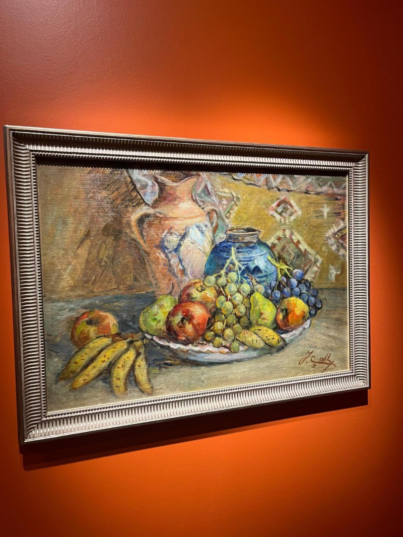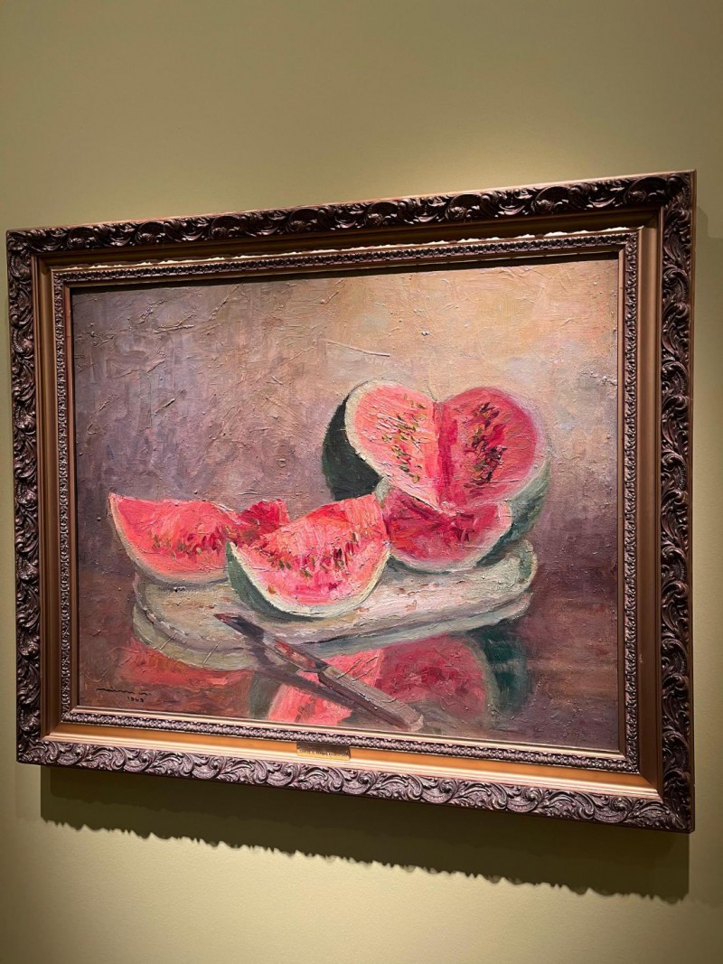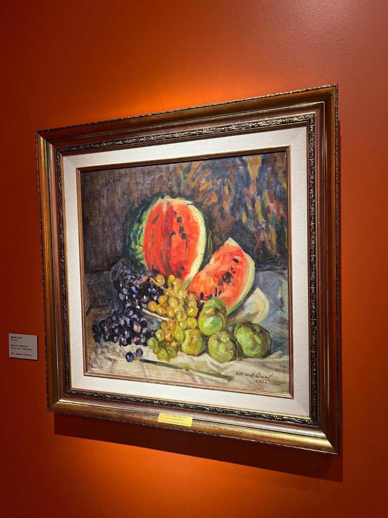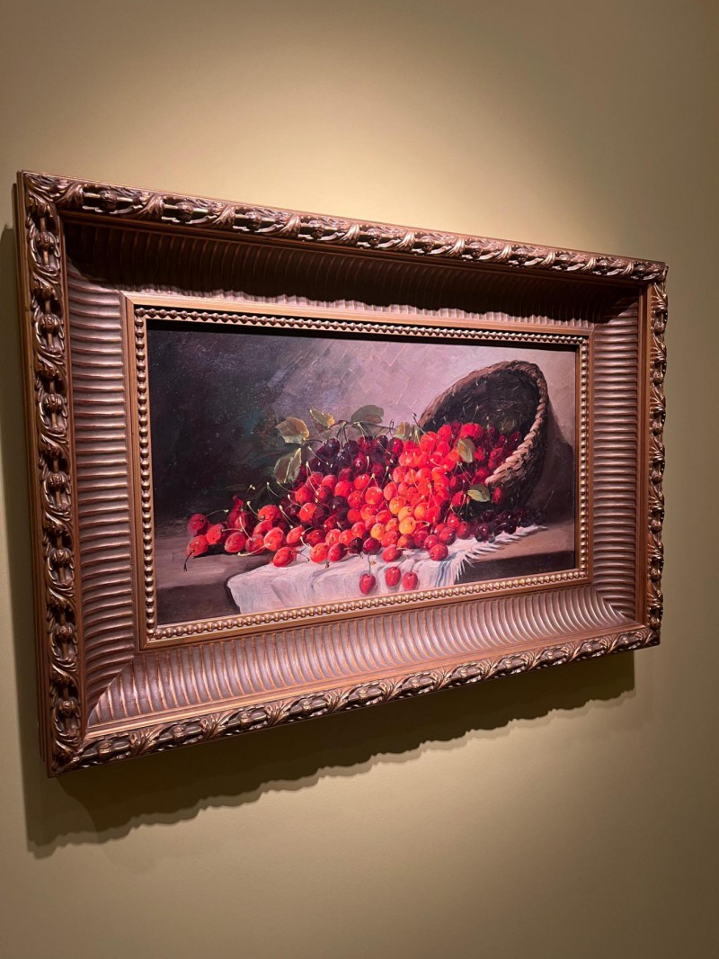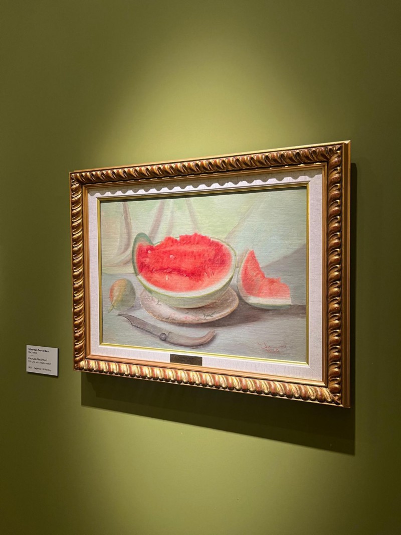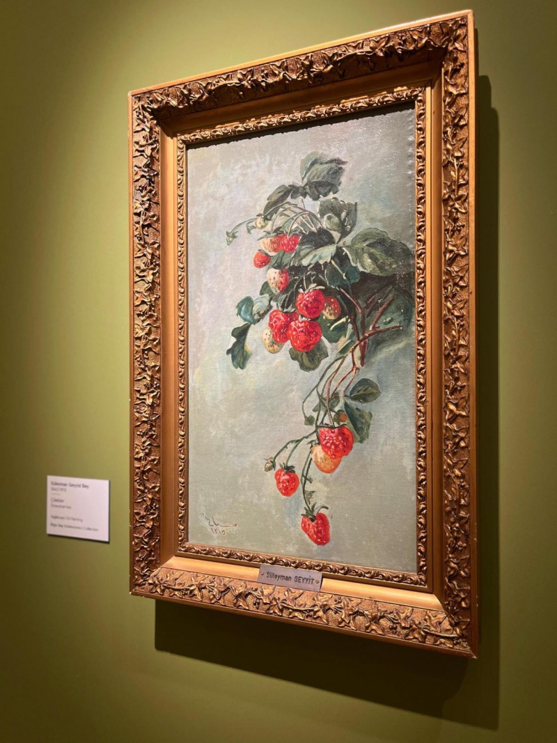 "Tat ve Sanat: Lezzetli Resimler" sergisi doğanın ahengiyle dizilmiş meyve tabakları içerisinde kıpkırmızı narlar, olgunluktan çatlamış incirler, salkım salkım üzümlerle iştah açıcı görünümlerinin yanı sıra sanatseverleri düşüncelerinde derin bir yolculuğa çıkarıyor.