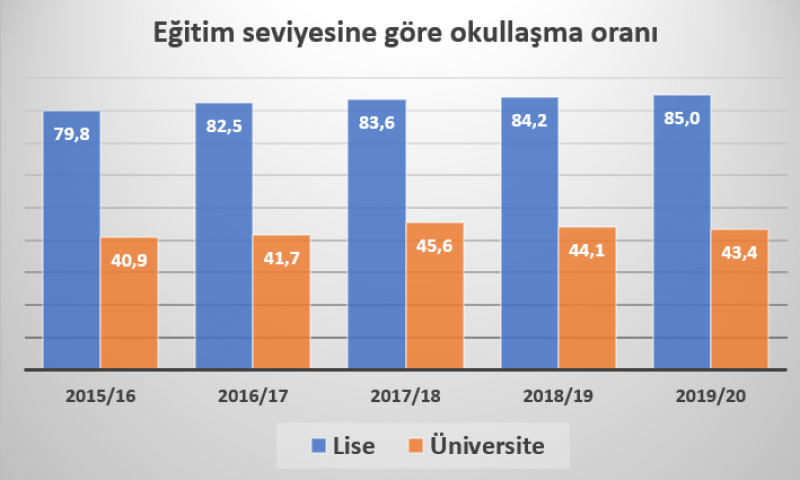 TÜİK sayfasında yer alan “İstatistiklerle Gençlik, 2020” verilerine göre lise düzeyinde okullaşma oranı yüzde 85’ler düzeyinde iken, üniversite düzeyinde okullaşma oranı yüzde 43’lere düşüyor.