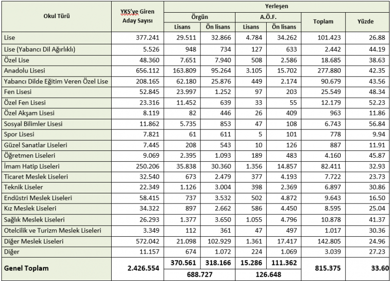 2021 YKS sınav sonuçlarına göre üniversiteye yerleşenlerin sayıları ve oranları (Kaynak: ÖSYM)