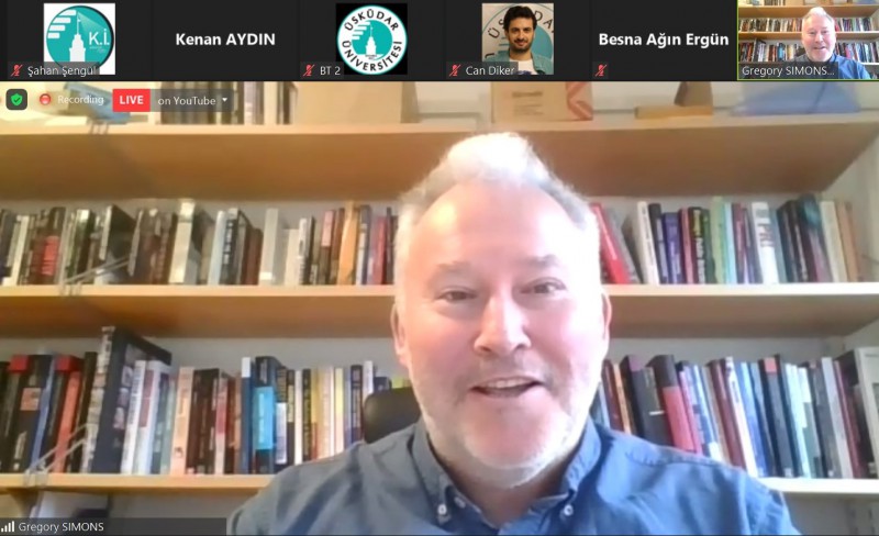 Uppsala Üniversitesi'nden Doç. Dr. Gregory Simons, "Kriz İletişimi Perspektifinden Zorunlu Koronavirüs Tecrit Anlatısına Karşı Dijital Direniş" başlıklı konuşmasında, kriz ne kadar uzun sürerse o kadar fazla hasar oluşacağını ve buna mukabil de bu etkileri ortadan kaldırmanın o kadar zor olacağının düşünüldüğünü, bu noktada daha çok krizin fiziksel tarafına odaklanıldığını ancak bir krizin siyasal olarak da bir eylem çağrısı, bir siyasal seferberlik durumu olduğunu belirtti. ABD’nin en zenginlerinin Koronavirüs krizi esnasında üç trilyon dolardan daha fazla gelir elde ettiklerini, yoksulların ise üç trilyon dolar civarında bir rakamı kaybettiklerini, bunun sorumlusunun da hükümet politikaları olduğunun görüldüğünü vurguladı. Bu süreçte bireysel hak ve özgürlüklerin kötü etkilendiğini ifade eden Simons, özellikle demokratik ülkelerde korkunun toplum içinde yayılmaya başladığını, halkın özgürlük ve güvenlik ikilemi arasında kaldığını, kriz döneminde karantina taraftarı olanlar ve karantinaya inanmayanlar olarak toplumun ikiye bölündüğünü belirtti.