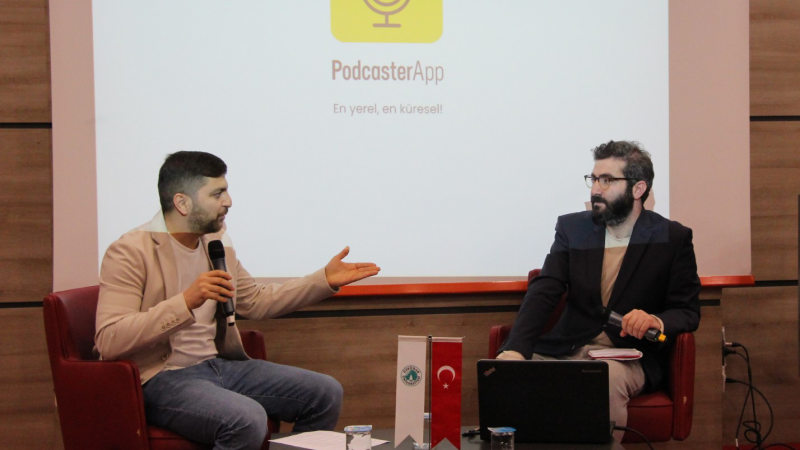 Podcast dinleyicilerindeki artışla birlikte konunun ilgisini çekmeye başladığını anlatan Rıfat Özcan, “Ben 2020’den beri podcastle ilgileniyorum. Genele baktığımızda geçmişten bugüne podcast dinlemede bayağı bir artış söz konusu. Hatta şöyle bilgi vereyim, Koray Kocabaş’ın 2020 yılında yani pandeminin başında yaptığı araştırmaya göre mesela Spotify’da kaç tane podcast var, kaç tane hangi konuda ne var diye araştırmış. Mesela Mart 2015’e kadar Türkiye’de 393 tane podcast varmış Spotify’da. Şu anki verilere göre ise bu sayı 15 bine yükselmiş. Dinleyici bazında da 2020’de yapılan bir araştırmaya göre 2 milyona yakın dinleyici var. Günümüzde ise 10 milyonu geçti” ifadelerini kullandı. Podcast yayıncılığında edindiği deneyimleri öğrencilere aktaran Özcan, “Podcaste başlarken öncelikle kendinize doğru bir konu belirlemeniz gerekiyor ve bunu anlatacak doğru kişi siz misiniz buna karar vermeniz gerekiyor. Daha sonra bu podcast kimlere hitap ediyor bunları düşünmeniz gerekiyor. Hangi formatta yaptığınız da çok önemli. Tek mi yapacaksınız, yuvarlak masa mı yapacaksınız, konuklu mu yapacaksınız soruları gündeme geliyor. Bunlara karar vermek ve sürdürülebilir olması da çok önemli. Mesela insanlar bir Podcaste başlıyorlar, birkaç bölüm okuyorlar ama devamı gelmiyor. Dolayısıyla ben herkese minimum 10 bölümlük bir akış hazırlamalarını öneriyorum” şeklinde konuştu.