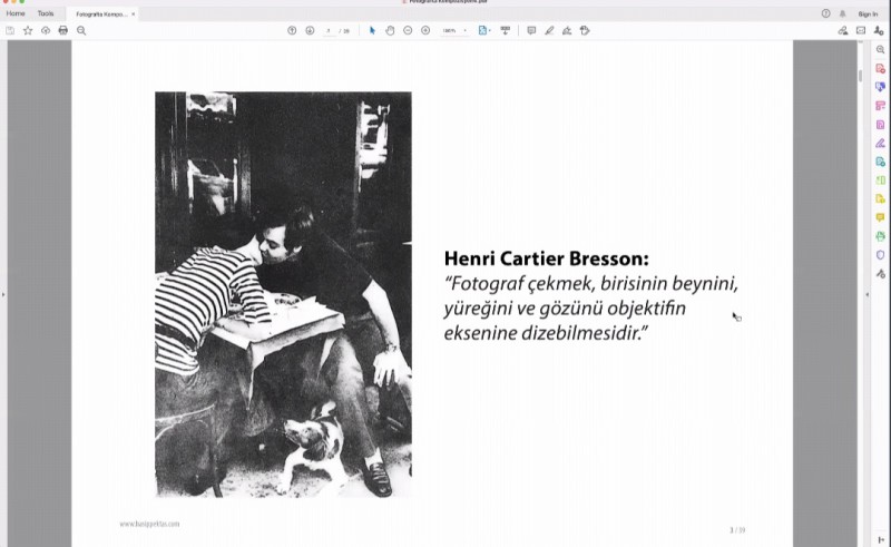 Prof. Hasip Pektaş, gösterdiği örnek fotoğraf üzerinden anı yakalamanın önemli olduğunu şu sözlerle vurguladı: “Fotoğrafta kompozisyon, fakültede ya da derslerine girdiğim üniversitelerde oluşturduğum bir birikimdir. Deneyimlerimi de bunun içine kattım. Ankara Fotoğraf Sanatı Derneği Yönetim Kurulu'ndayken fotoğraf eğitimi kursları da veriyorduk. Oradaki birikimlerden de yararlanıyorum. Herkes fotoğraf çektiğini düşünür. Ben de kendi açımdan böyle düşünürüm. Fakat daha iyi bir fotoğraf gördüğüm zaman o fotoğrafa da yakınırım. Henri Cartier Bresson ise 'Fotoğraf çekmek, birisinin beynini, yüreğini ve gözünü objektifi ekseninde düzebilmesidir' demiştir. Burada gördüğünüz fotoğraf, Bresson’un fotoğrafı. Bu fotoğrafın iki saniye öncesi ile iki saniye sonrasında karede bulunan köpek, öpüşenlere bakmayı bırakır. Önemli olan o anı yakalayabilmektir. O bakımdan fotoğrafı çekenin çok hazırlıklı, duyarlı ve gözüyle çekiyor olması gerekmektedir.”