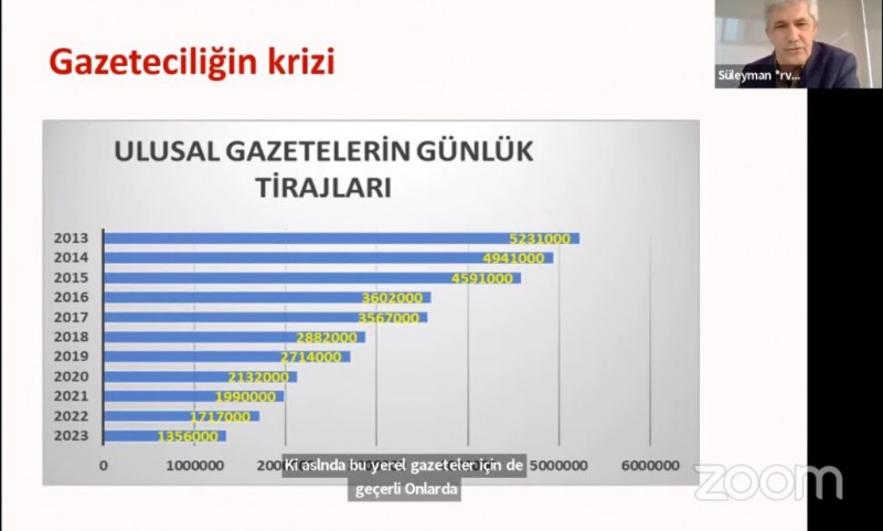 Prof. Dr. Süleyman İrvan, konuşmasında, gazeteciliğin günümüzde tiraj ve finansman krizi, güven krizi ve kimlik krizi olmak üzere üç derin kriz yaşadığını anlattı. Prof. İrvan şunları söyledi: “Bu krizlerden ilki, basılı gazetelerin yaşadığı tiraj krizidir. Tirajlar her geçen yıl düşüyor ve basılı gazeteler birer birer kapanıyor. Bu krizi en şiddetli biçimde hisseden ülkelerden biri de Türkiye. TÜİK tarafından hazırlanan Yazılı Medya İstatistiklerine göre, gazeteler son 10 yılda yüzde 65 tiraj kaybetti. Ulusal gazetelerin günlük tirajlarındaki düşüş ise yüzde 75’i buldu. Basılı gazetelerde tiraj krizi yaşanırken, internet medyasında da finansman krizi söz konusu. İnternet medyası büyük ölçüde Google, Facebook, Instagram, X gibi büyük teknoloji şirketlerinin insafına terkedilmiş durumda. Reklam gelirlerinde aslan payı bu şirketlere gidiyor, haber medyası da reklam gelirlerinden pay kapıp yaşamaya çalışıyor.”