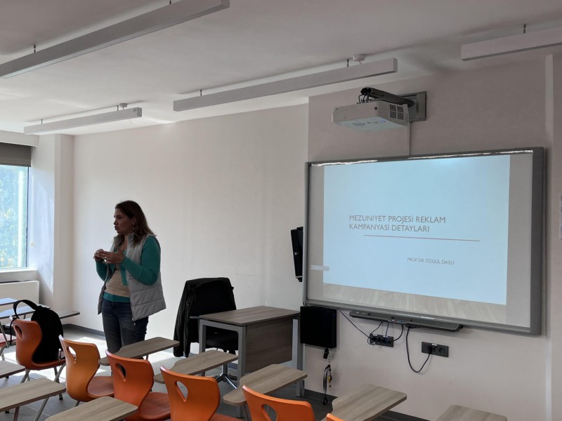 Reklamcılık Bölümü 4. sınıf öğrencilerinin katılımıyla düzenlenen mezuniyet projesi bilgilendirme toplantısında, dönem boyunca yürütülecek projelerin kapsamı ve değerlendirme süreçleri ele alındı. GAB-108 numaralı derslikte gerçekleşen toplantıya Reklamcılık Bölüm Başkanı Prof. Dr. Özgül Dağlı ve Doç. Dr. Cihan Becan katıldı. Toplantıda öğrencilere, mezuniyet projesi süreci, hazırlık aşamaları, sunum beklentileri ve yaratıcı brief geliştirme yöntemleri hakkında detaylı bilgi verildi. Öğrencilerin, hazırlayacakları brief doğrultusunda reklam kampanyaları tasarlayacaklarını belirten Prof. Dr. Dağlı, bu projelerin sektöre geçişte önemli birer adım olacağını vurguladı.