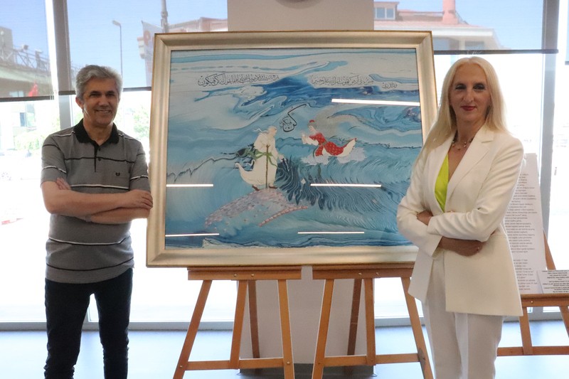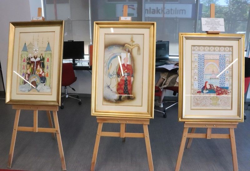 22 eserin bulunduğu sergide; “Flüt Çalan Kız, Nuh’un Gemisi, Osman Gazi, Kanuni Sultan Süleyman ve Kılıcı, Av Sahnesi, Kaftan-Sorguç-Hançer, Kanuni Sultan Süleyman ve Hanedanı, Yeniçeri, Muhibbi’den Hürrem’e Nağmeler, Levni Esintiler Nar-ı Aşk, Lokman Hekim ve Ölümsüzlük Şehri Misis, Devlet-i Aliyye’de Sultanların İntikali – Divan-ı Hümayun, Fatih’in Kılıcı, Her Kadın Bir Alem Her Alem Bir Kapı, Cihangir Hükümdar ile Şah Abbas’ın Buluşması, Raks Zamanı, Altın Şehir Üsküdar” isimli eserler yer aldı.