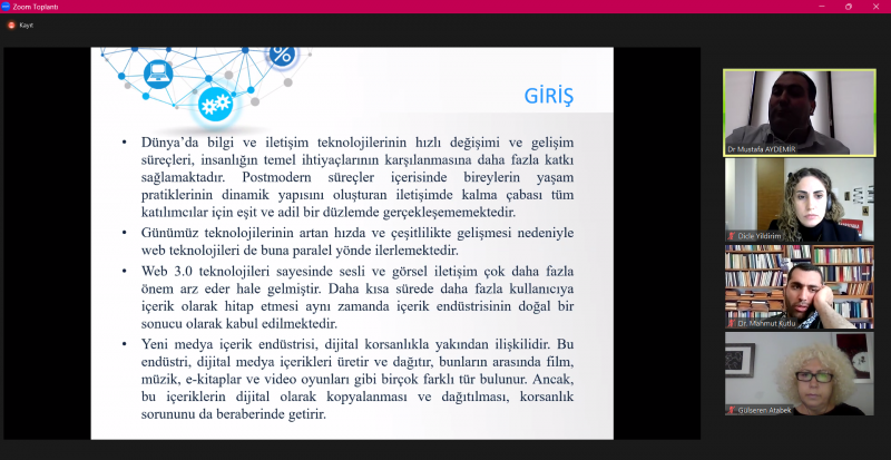 Oturumda İstanbul Gelişim Üniversitesi’nden Dr. Öğr. Üyesi Nisa Yıldırım, "Ayın Karanlık Yüzünden Göbeklitepe’ye: Komplo Teorisi Temalı Youtube İçeriklerinin Kurmaca ile İlişkisi Üzerine Bir Değerlendirme"; Mersin Üniversitesi’nden Burçak Görel, "Dijital Kapitalizm Ekseninde Kadınların Ev İçi Emeği İle Youtube Kesişimi"; Nevşehir Hacı Bektaş Veli Üniversitesi’nden Öğr. Gör. Özge Özçelik Baloğlu, "Sağlık Haberleri Bağlamında Dijital Medyada Üretilen İçeriklerde İhtiyaca Dair Söylemlerin İncelenmesi: TRT Sağlık Haberleri Örneği"; Bağımsız araştırmacı Dr. Mustafa Aydemir, "Yeni Medya İçerik Endüstrisinde Korsanlık Sorunsalı ve Dijital Oyunlarda Denetim Politikaları"; Bağımsız araştırmacı Dr. Mahmut Kutlu, "Kahramanmaraş Depremi Karikatürlerinin Göstergebilimsel İncelenmesi" başlıklı bildirilerini sundular.