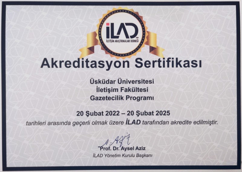 İLAD Başkanı Prof. Dr. Aysel Aziz imzalı yazıda şu ifadeler yer alıyor: “Üsküdar Üniversitesi İletişim Fakültesi Gazetecilik Programı hakkında İLEDAK Değerlendirme Ekibince hazırlanan Ara Değerlendirme Raporu, İLEDAK Tutarlılık Komisyonu tarafından incelenmiş ve İLEDAK toplantısında görüşülmüştür. İLEDAK İletişim Eğitimi Değerlendirme Akreditasyon Kurulunun yaptığı değerlendirme sonucu, Gazetecilik programı için daha önce verilen 2 yıl akreditasyon kararının 5 yıla tamamlanması için '3 yıl geçerli akreditasyon' kararı verilmiştir. İLEDAK’ın kararı, İLAD Yönetim Kurulu’nun 29 Ocak 2022 tarih ve 2022/01 sayılı kararı ile uygun bulunmuş ve onaylanmıştır. Üsküdar Üniversitesi İletişim Fakültesi Gazetecilik Programı, 20.02.2022 tarihinden 20.02.2025 tarihine kadar geçerli olmak üzere İLAD Akreditasyon sertifikası almaya hak kazanmıştır.”