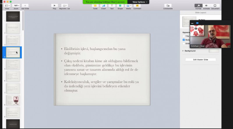 Etkinliğin açılış konuşmasına konukları tanıtarak başlayan Prof. Dr. Hasip Pektaş, “Bugünkü Ekslibris Araştırmaları panelimize hepiniz hoş geldiniz. Öncelikle konuşmacı olarak katılan isimlere ve izleyicilerime çok teşekkür ediyorum. İlk konuşmacımız, Yakın Doğu Üniversitesi’nden hocamız Dr. Gökhan Okur. Gökhan, Hacettepe Üniversitesi’nde 1998 yılında verdiği yüksek lisans tezi ‘Ekslibris ile İletişim’ başlıklı tezi ile bu alanda ilk tez yapan arkadaşımızdır. İkinci konuşmacımız, Dr. Öğr. Üyesi Salih Denli. Fatih Sultan Mehmet Üniversitesi’nde hocadır. Salih de ilk ‘Sanatta Yeterlilik’ tezi yapan arkadaşımızdır. Hacettepe Üniversitesi’nde 2004 yılında ‘Ekslibris Tasarımında Tipografi ve Kalibrafi Kullanımı: Tipografik ve Kalibratik Ekslibris Uygulamaları’ başlıklı tezini yapan arkadaşımızdır. Üçüncü konuşmacımız, Uludağ Üniversitesi’nde profesör adayı Doç. Dr. Sezin Türk Kaya. Sezin de Anadolu Üniversitesi’nde yüksek lisans tezi olarak ‘Geçmişten Günümüze Almanya’da Ekslibris’ başlıklı tezini 2007 yılında yaptı. Sezin’in de tezi özellikle bu sanatın doğduğu ülke olan Almanya’dan örneklerle bizi zenginleştireceğine inanıyorum. Yardımcı konuşmacımız Elazığ Valiliği’nde Grafik Tasarımcı olan İsmail Aslan. Arkadaşımız Fırat Üniversitesi’nden mezun ve yüksek lisansını orada yaptı. Şu an Elazığ Valiliği’nde çalışıyor. ‘Örnek Uygulamalar ve Grafik Tasarım Çözümlemeleri’ başlıklı bir tezi var” ifadelerini kullanarak sözü ilk konuşmacı Dr. Gökhan Okur’a bıraktı.