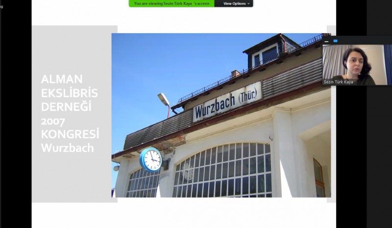 Almanya’daki kitap ve kütüphane gelişimi üzerinden konuşarak tezini anlatan Doç. Dr. Sezin Kaya, “‘Geçmişten Günümüze Almanya’da Ekslibris’ konusu üzerinde çalıştım. Ben bugünkü sunumda ekslibris ile tanışmam ve tezimden bahsetmek istiyorum. Tezimin birinci bölümünde kitap ve kütüphanelerin gelişimi üzerinde durdum. İkinci kısımda Almanya’da kütüphane ve kitap işaretleri hakkında yazdım. Tezim Almanya merkezliydi. Yüzyıllara göre ayırmıştım. İlk örnekleri, dönemin önemli sanatçılarını ve eserleri hakkında çalıştım. Daha sonra 17. ve 18. yüzyılda Almanya’da kitap ve kütüphane gelişimi, belirli sanatçıların üzerinden de 19. ve 20. yüzyıllar üzerinde durdum. 19. ve 20. yüzyılda Alman ekslibris örneklerine yer verdim. Üçüncü bölümde günümüz Almanya’sındaki ekslibris örnekleri, tasarımcılar ve nelerin yapıldığı kısımlar vardı. Belli sanatçı örnekleri var. Dördüncü bölümde Almanya’daki ekslibris koleksiyonları ve Almanya’daki ekslibris oyuncuları üzerine bir kısım araştırmalarım var. Bana destek olan Henry Dolber’in koleksiyonundan parçalar da yer alıyor. Onun daha önceden bir tez çalışması vardı. Onun da ekslibris çalışması olduğu için o da bana tezimde yardım etti. Beşinci bölümde Alman Ekslibris Derneği’ni inceledim. Tarihsel gelişimini ve tartışmaları inceledim. Günümüzde bu sanata katkılarının neler olduğunu araştırdım. Aslında koleksiyoncular ve kitapseverler çeşitli baskılarda bir araya geliyorlar. Dergiler üzerinden haberleşiyorlar. Günümüz sosyal medyası gibi düşünebiliriz. Çeşitli randevular oluşturuyorlar ve bir araya geliyorlar. Alman Ekslibris Derneği olarak şu anda varlığını sürdüren derneğin ilk kısmı sol taraftaki logo ile başlıyor. Dergi ilk başlarda yıllıklar yayınlıyor. Bu yıllıklar bazen tek bir kişi tarafından yayınlanıyor. Bazen ise gruplar halinde yapılıyor. Düzenli olarak çıkardıkları çıkarmaya devam ettikleri dergileri var. Dergi üzerinden yayınlar ve makaleler yayınlanıyor. Toplantı günleri belirleniyor ve ekslibris değiş tokuşları, tasarımcılar ve koleksiyoncular ile çeşitli etkinlikler sayesinde bir araya geliyor. Ben yüksek lisans tez çalışmamda amaç olarak aslında başlangıcından bugüne kadar olan tarihsel süreci Almanya’daki ekslibris sanatının nasıl bir değişim ve gelişim içerisinde olduğunu araştırdım. Almanya’da ekslibris’in sadece bir koleksiyoncular arası değiş-tokuş belgesi olarak değil aynı zamanda bir akademik çalışma içerisinde de değerlendirildiği sonucu ile karşılaştık. Bu açıdan Almanya'nın ekslibris örneğinin gelişiminee katkılarını inceledim. Bununla ilgili bazı sorular vardı. ‘Mülkiyet kavramı nasıl doğmuştur? Tarihte bilinen en eski kitap ve kütüphane işaretlerine bugünkü anlamıyla ekslibrise nerede ve ne zaman rastlanmıştır?’ bunları araştırdım” dedi.