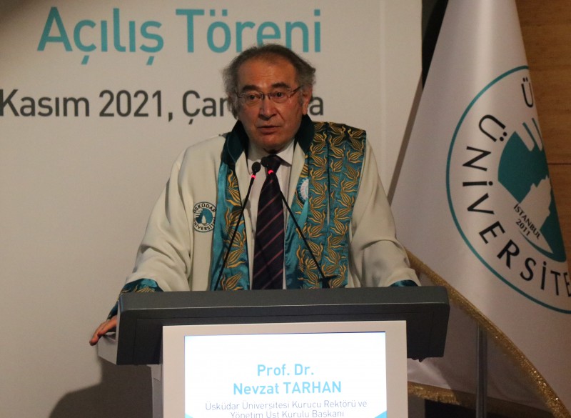 Törenin açılış konuşmasını yapan Üsküdar Üniversitesi Kurucu Rektör Prof. Dr. Nevzat Tarhan şunları söyledi: "2021-2022 eğitim öğretim döneminin açılışını yapıyoruz. Kovid bizi mahsur bıraktı. Uzun zaman bu salonda bir araya gelemedik. Biz üniversite olarak bu dönemi birçok şey öğrenerek en az zararla aşma yolunda ilerliyoruz. Üniversite koridorlarımız çok şükür öğrencilerle dolabildi. Eğitim, fijital dediğimiz, öğrencilerin yarısının sınıfta, yarısının online olduğu sistemle güzel bir şekilde yürüyor. Baştaki zorlukları aştık, akademik açılışı burada yapabilecek seviyeye geldik. Birbirimizle hasret tazeleme gibi oldu. Kovid bizlere yaşam felsefemizi sorgulamayı öğretti. Bazı şeylerin eskisi gibi olamayacağını, yeni normaller oluşturmamız gerektiğini gösterdi. Bu arada bilimin ne kadar önemli bir rehber olduğunu, evrensel koruyucu kuralların hala geçerli olduğunu gördük."