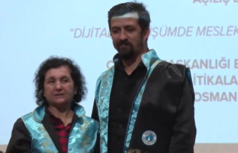 İletişim Fakültesi Görsel İletişim Tasarımı Bölümü'nde doçentlik kadrosuna yükselen Doç. Dr. Tolga Erkan'a cübbesini İletişim Fakültesi Dekanı Prof. Dr. Nazife Güngör giydirdi.