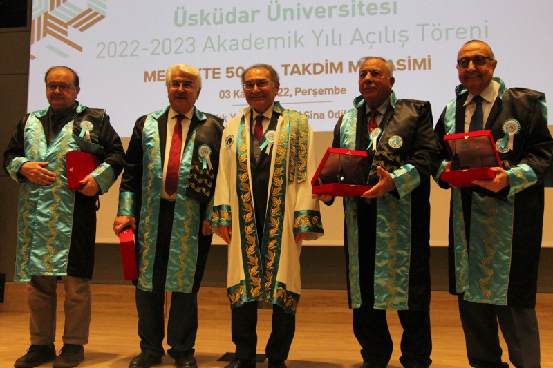 Meslekte 50. yılını dolduran Üsküdar Üniversitesi akademisyenleri için bu yıl ilk kez düzenlenen 50. Yıl ödülleri de törende sahiplerine takdim edildi. Prof. Dr. Nevzat Tarhan, meslek hayatında 50 yılı dolduran aralarında Mühendislik ve Doğa Bilimleri Fakültesi Elektrik Elektronik Mühendisliği Bölüm Başkanı Prof. Dr. Şaban Selim Şeker, Sağlık Bilimleri Fakültesi Dil ve Konuşma Terapisi Bölüm Başkanı Prof. Dr. Ahmet Kontrot, Sağlık Bilimleri Fakültesi Ergoterapi Bölüm Başkanı Prof. Dr. Şefik Dursun ve Tıp Fakültesi Tıbbi Anabilim Dalı Başkanı Prof. Dr. İbrahim Öztek’e plaket takdimini yaptı.
