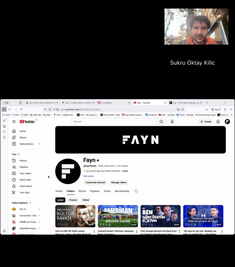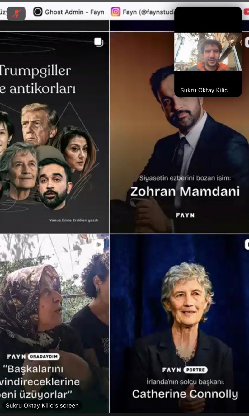 Üsküdar Üniversitesi İletişim Fakültesi Yeni Medya ve İletişim (İngilizce) Bölümü tarafından yürütülen Yeni Medya Atölyesi dersi kapsamında, 2025 Güz döneminin konuklarından biri Fayn Kurucu Direktörü Şükrü Oktay Kılıç oldu. “Dijital Medyada Yaratıcı Hikâye Anlatıcılığı: Scrollytelling ve Horizontal Scrollytelling” başlıklı webinarda, Kılıç hem Fayn’ın kuruluş hikâyesini hem de dijital medyada film ve gazetecilik disiplinlerini birleştiren yaratıcı anlatım biçimlerini katılımcılarla paylaştı. Yaklaşık 45 dakika süren buluşma, Kılıç’ın dijital medya dünyasında gelişen beceriler üzerine verdiği öneriler ve öğrencilerin deneyim paylaşımlarıyla sona erdi.